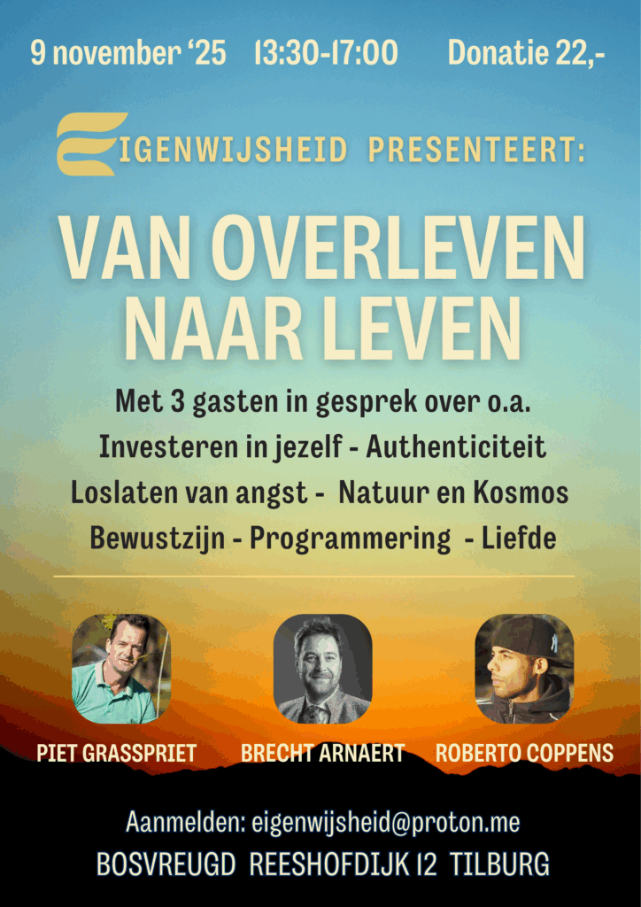 Een bijzondere middag op 9 november, een live podcast waar vanuit het hart gesproken wordt. Door verschillende inzichten van de sprekers op uiteenlopende onderwerpen, willen we je inspireren om meer met je authenticiteit en potentieel te verbinden. Meer van overleven naar leven te gaan.